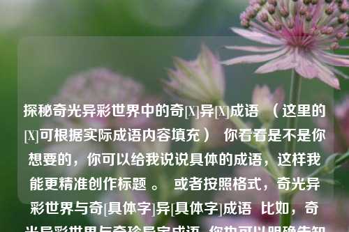 探秘奇光异彩世界中的奇[X]异[X]成语 (这里的[X]可根据实际成语内容填充) 你看看是不是你想要的,你可以给我说说具体的成语,这样我能更精准创作标题 。 或者按照格式,奇光异彩世界与奇[具体字]异[具体字]成语 比如,奇光异彩世界与奇珍异宝成语 你也可以明确告知需求,以便我更准确地给出标题 。 又或者,奇光异彩世界中的奇花异草成语探寻 (你可以根据实际情况修改调整,希望对你有帮助) 再不然,奇光异彩世界与奇谈怪论成语关联 (同样可按需修改) 你看看哪个符合你心意,要是都不
