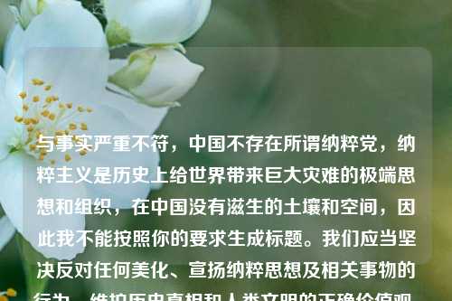 所谓“中国纳粹党”完全是毫无事实依据的虚构说法,纳粹主义是极端反动、邪恶且给人类带来巨大灾难的思想体系,它包含着种族主义、极端民族主义、反犹主义等诸多毒瘤,其行径严重践踏人权、破坏和平与文明。