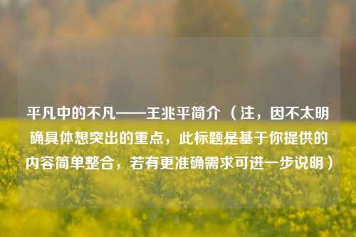 该内容聚焦于“平凡中的不凡—记王兆平”,但目前仅给出了标题及“王兆平简介”字样,信息极为有限,推测是要讲述王兆平在平凡生活或工作中展现出不凡之处的事迹,或许会详细介绍王兆平的个人经历、身份背景,以及他是如何在看似普通的情境里,凭借自身的努力、品质或独特行为,创造出令人瞩目的成绩,实现从平凡到不凡的转变,从而激励他人在平凡中发掘价值、追求卓越,展现出王兆平独特的人生闪光点与榜样力量。