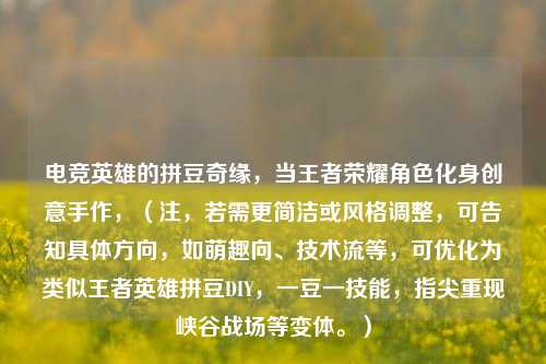 - 电竞英雄的拼豆奇缘,当王者荣耀角色化身创意手作,(注,若需更简洁或风格调整,可告知具体方向,如萌趣向、技术流等,可优化为类似王者英雄拼豆DIY,一豆一技能,指尖重现峡谷战场等变体。)2026-01-17
