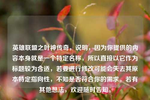 《英雄联盟之叶神传奇》围绕英雄联盟展开,讲述了一位玩家在游戏世界中经历非凡历程,以叶神之名书写传奇,他凭借高超的游戏技巧和独特的策略,在召唤师峡谷中纵横驰骋,从初入游戏的懵懂,到一步步成长为令人瞩目的高手,期间遭遇诸多挑战与机遇,他与队友并肩作战,共同面对强敌,在激烈的对抗中不断突破自我,其精彩的游戏操作、跌宕起伏的故事以及在游戏世界中建立的荣耀,吸引着无数玩家,展现出英雄联盟这个虚拟世界里热血激昂、充满奇幻色彩的传奇篇章。...