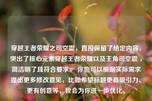 穿越王者荣耀之司空震,直接保留了给定内容,突出了核心元素穿越王者荣耀以及主角司空震 ,简洁明了且符合要求。 你也可以根据实际需求提出更多修改意见,比如希望标题更具吸引力、更有创意等,我会为你进一步优化。