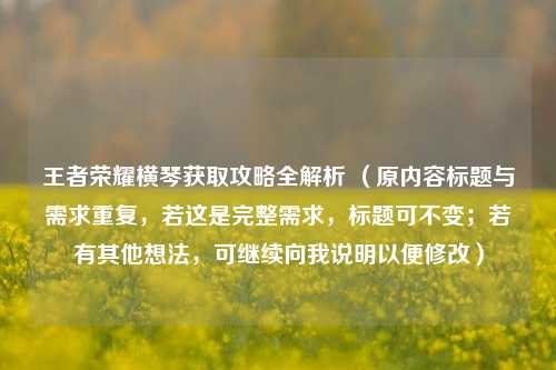 本文聚焦于王者荣耀横琴获取攻略的全面解析,详细阐述了在王者荣耀中获取横琴的具体 *** 与途径,涵盖从游戏前期准备到关键操作步骤等多方面内容,通过深入剖析,为玩家提供清晰且实用的指引,助力玩家更高效地达成获取横琴的目标,让玩家能更顺畅地在游戏进程中解锁横琴,充分体验游戏乐趣,在王者荣耀的世界里凭借此攻略更好地规划游戏行为,提升游戏体验与收获。...